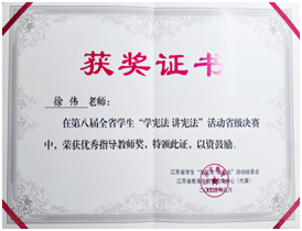 第八届江苏省学生“学宪法讲宪法”活动省级决赛暨“法治第二课堂”特别活动于近日在南京审计大学举行。全省66所高校81名素养竞赛学生经过初赛的激烈角逐,20位同学脱颖而出参加省级决赛。在省级决赛中,伟德官网22级法律系学生郭佳宁喜获一等奖,徐伟老师获优秀指导教师奖。