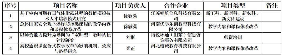 近日,教育部高等教育司发布了《关于公布2023年产学合作协同育人项目立项名单的通知》(教高司函〔2023〕11号),学院“基于室内可燃有毒气体泄露过程的数值模拟技术人才培养模式研究”等4个项目获准立项。