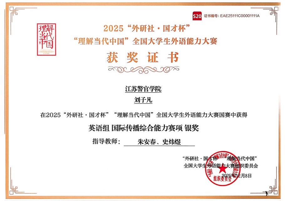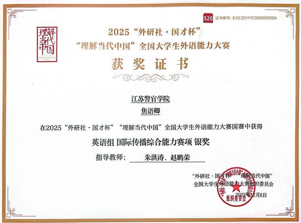 在江苏赛区英语组的激烈比拼中,伟德官网学子多点开花、佳绩频传,共收获一等奖2项、二等奖5项、三等奖5项。演讲赛项中,刘子凡摘得一等奖;综合能力赛项中,焦语卿勇夺一等奖,王心怡、康洺韶、商钦然斩获二等奖,殷子恩荣获三等奖;短视频赛项中,秦一心荣获二等奖;笔译赛项收获颇丰,王心怡荣获二等奖,李佩恒、梁馨怡荣获三等奖;口译赛项中,陈果与王心怡荣获三等奖。