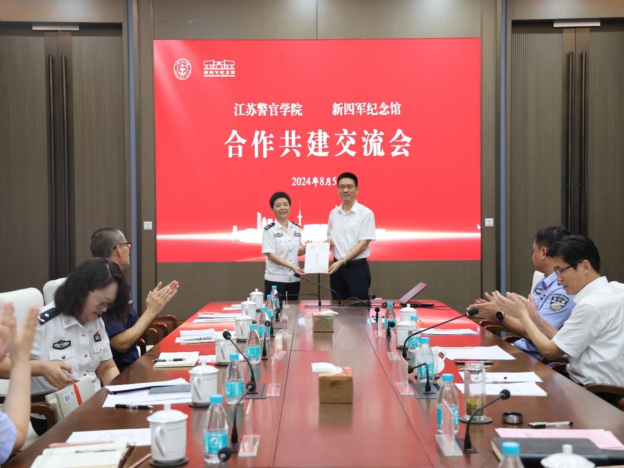 为深入学习贯彻习近平总书记考察盐城重要讲话精神,学习宣传贯彻党的二十届三中全会精神,用好用活新四军主题红色资源,讲好用好铁军精神“大思政课”,培养造就堪当时代重任的过硬铁军队伍, 8月5日,学院与新四军纪念馆签订馆校合作共建协议。双方在开展大思政教育教学、共建教育实践基地、加强科研协同研究、推进场馆专业建设、深化红色文化育人、打造红色宣讲队伍等5个方面深化交流合作,形成共识。学院党委副书记陈卫,盐城市公安局党委委员、政治部主任王伟,盐城市文广旅局副局长、新四军纪念馆馆长仇金标等出席活动。新四军纪念馆副馆长张树忠主持合作交流会。