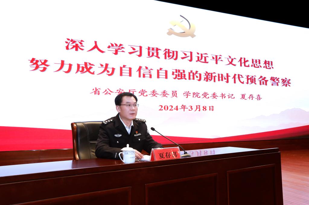3月8日下午,省公安厅党委委员、学院党委书记夏存喜给全体本科生、警务硕士研究生讲授“思政第一课”,勉励大家深入学习贯彻习近平文化思想,做自信自强的新时代预备警察,为建功新时代、奋进新征程做好思想和精神上的充分准备,更好完成党和人民赋予的光荣使命和神圣职责。