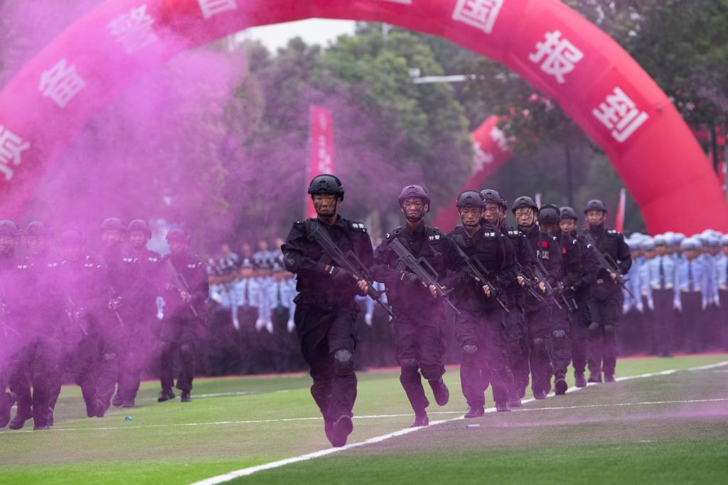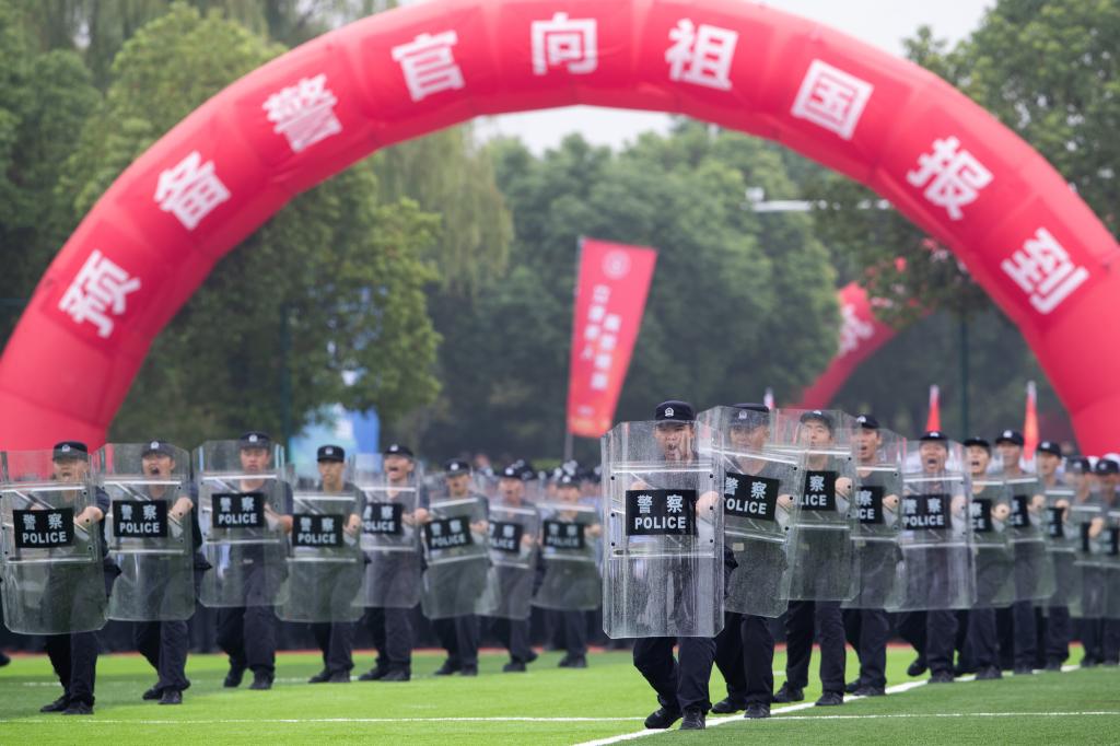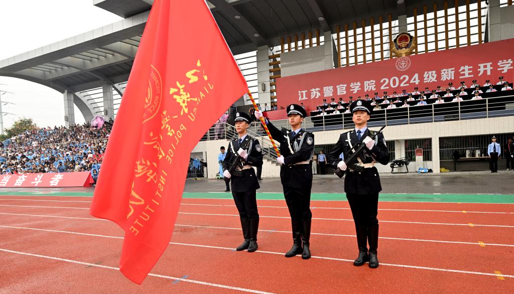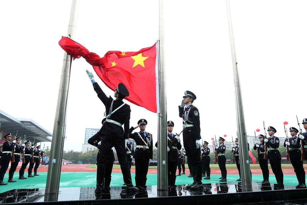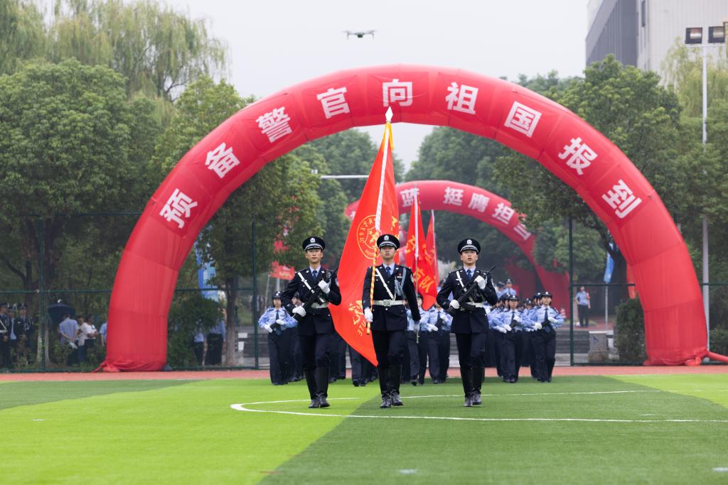 请党放心,强国有我。新生代表诗朗诵《预备警官向祖国报到》、全体新生合唱《歌唱祖国》将典礼气氛推向高潮。