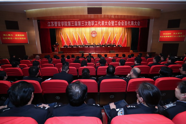 学院第三届第三次教职工代表大会暨工会会员代表大会在全场齐唱《人民公安向前进》的歌声中胜利闭幕。(文/高山,图/徐兆海)