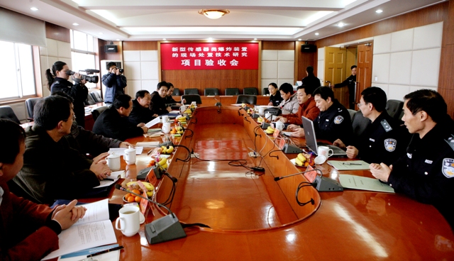 验收会根据江苏省科技厅委托,由江苏省公安厅科技处刘萱副处长主持。来自解放军理工大学、河南省公安厅治安总队、南京理工大学民爆中心、江苏省公安厅反恐怖工作处、南京森林公安专科学校的5位专家,学院封野副院长及有关部门的负责人出席了会议。