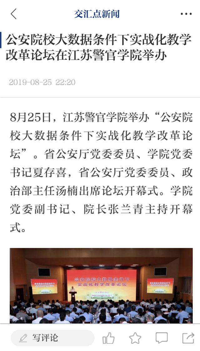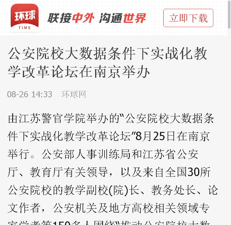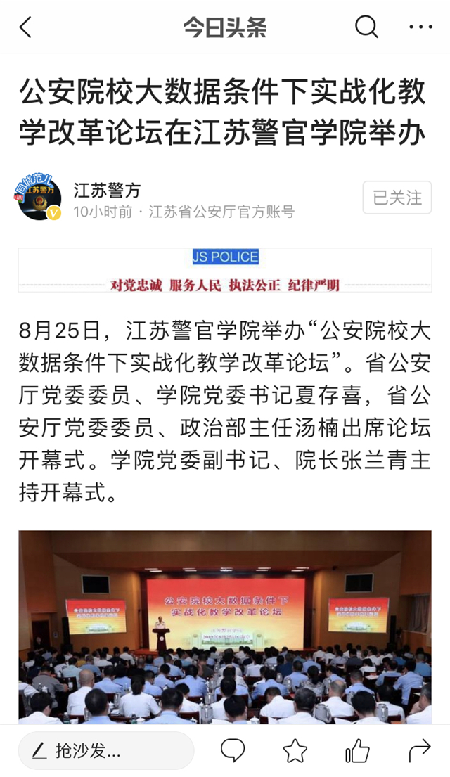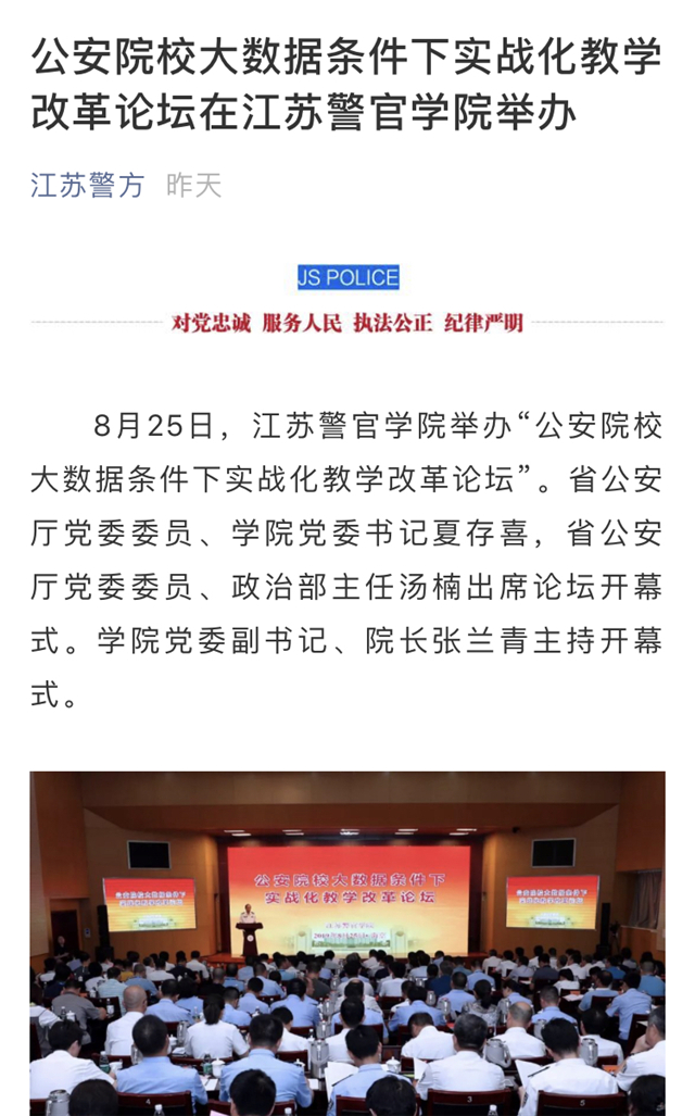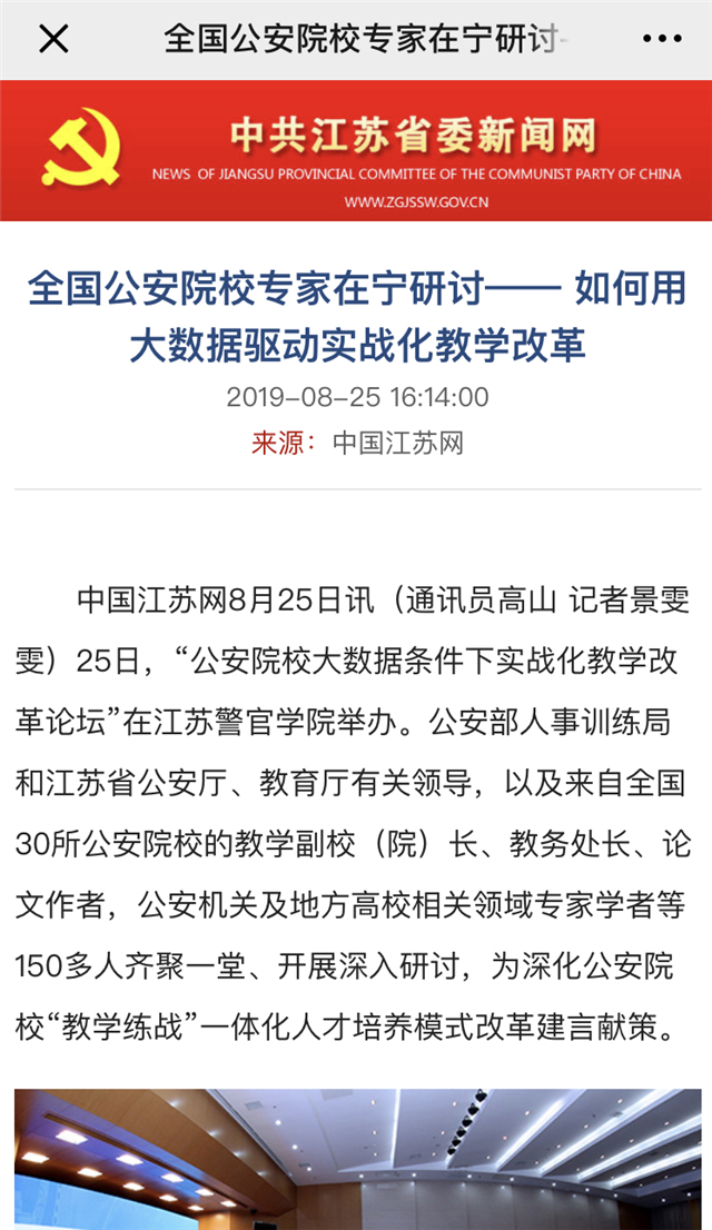 8月25日,bv伟德国际1946举办“公安院校大数据条件下实战化教学改革论坛”。论坛引起了社会媒体的关注,学习强国、人民网、中共江苏省委新闻网、环球网、江苏法制报、交汇点、江苏警方、今日头条等平台分别从不同角度和侧面报道了论坛召开情况。