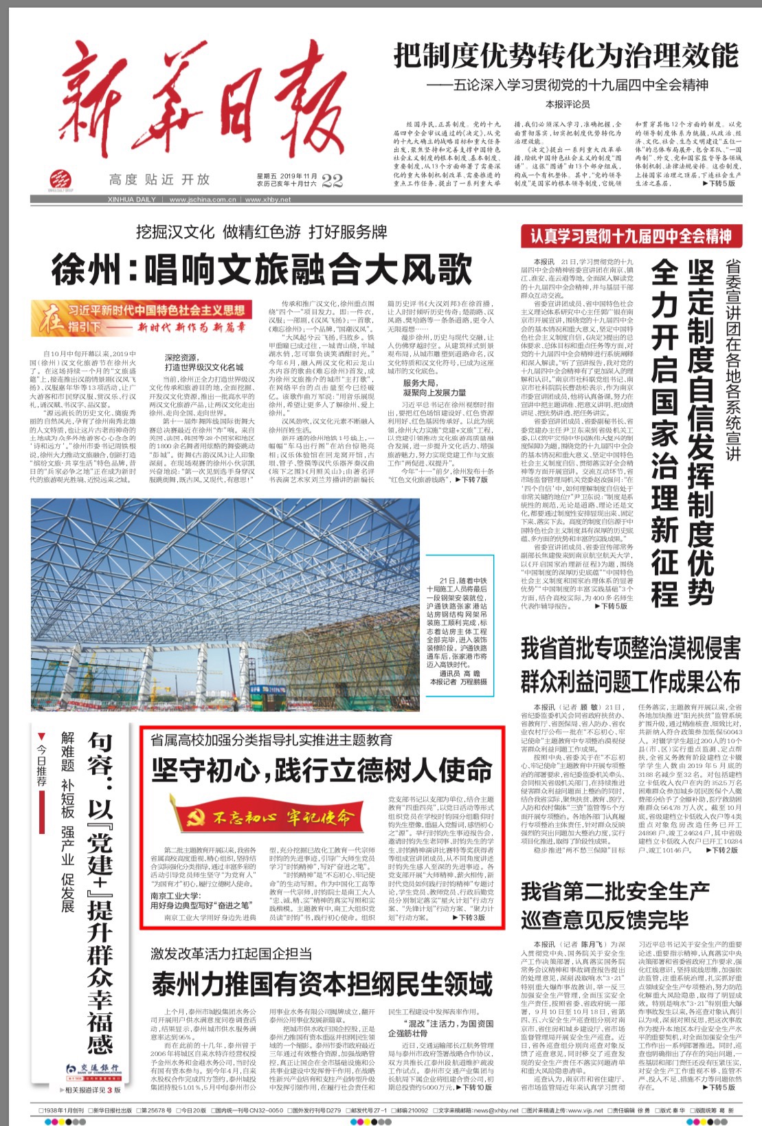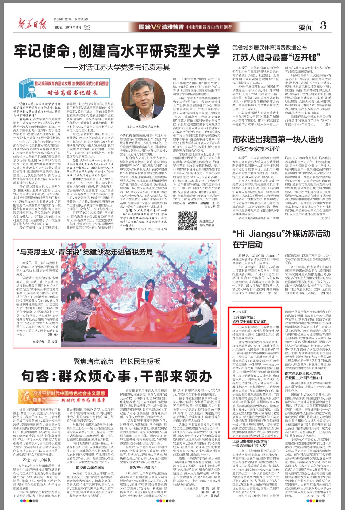 11月22日,新华日报一版刊发《省属高校加强分类指导扎实推进主题教育 坚守初心,践行立德树人使命》文章,报道了四所高校主题教育的特色做法,学院始终突出鲜明政治属性提升主题教育实效受到关注。
