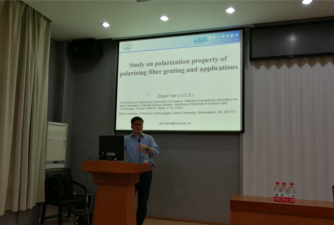 应德赢AC米兰中国官方网站院长丁华锋教授及科发院邀请,华中科技大学光学与电子信息学院闫志君博士于10月9号来我院作题为“倾斜光纤光栅偏振特性及其应用”学术报告。