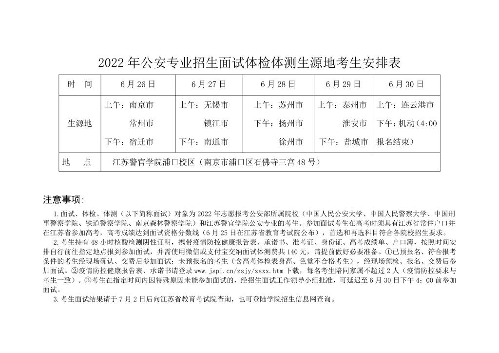 2022年公安院校面向江苏招生面试体检体测安排