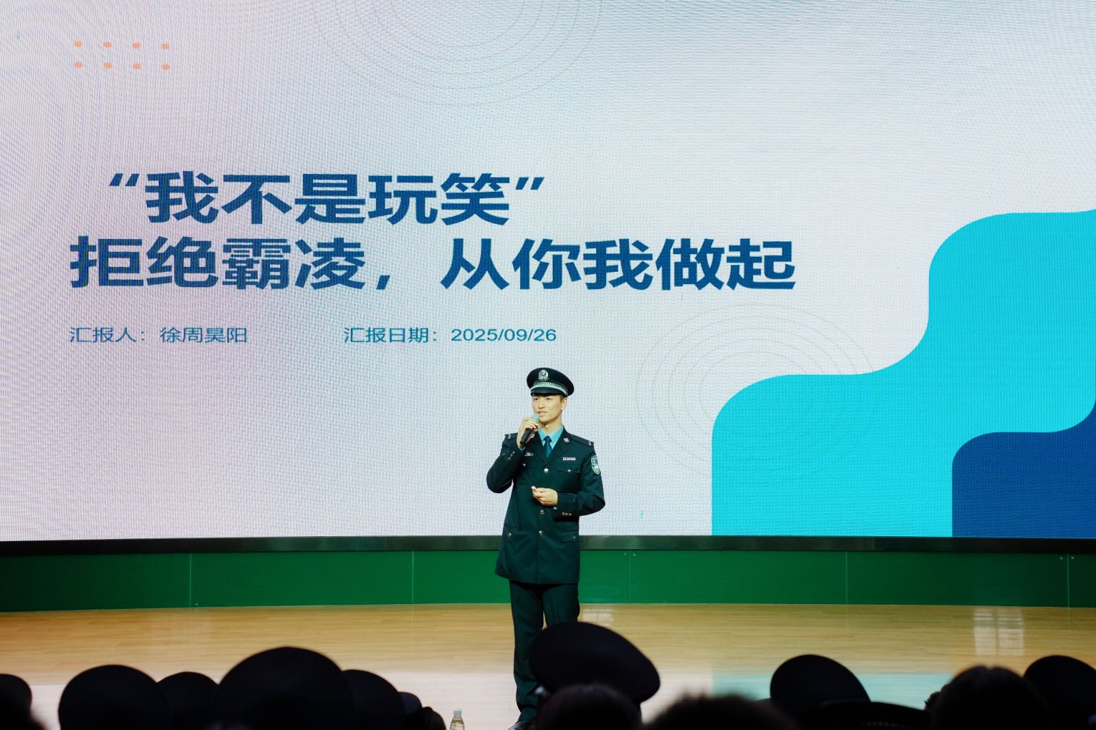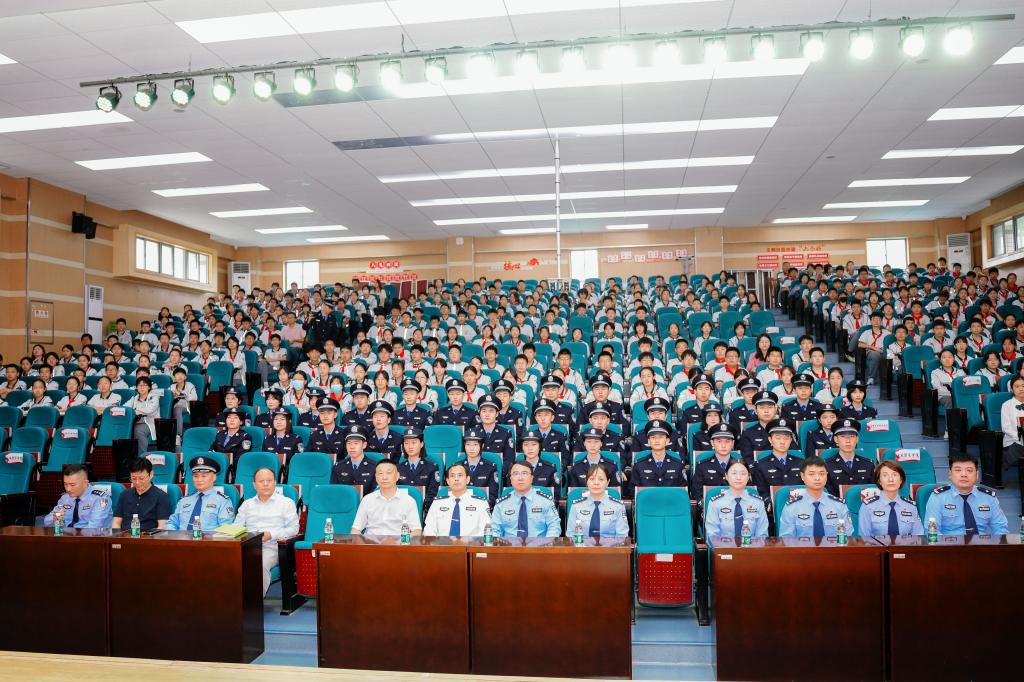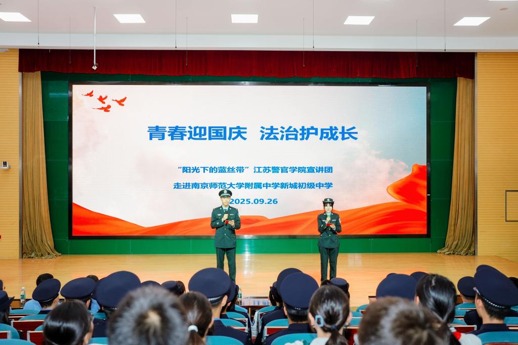 2025年9月26日,为迎接新中国成立76周年,深入贯彻落实江苏省公安厅“苏警安新”未成年人安全守护工程,“阳光下的蓝丝带”bv伟德国际1946宣讲团走进南京师范大学附属中学新城初级中学,为初二年级900余名同学开展“青春迎国庆 法治护成长”主题宣讲。本次活动旨在通过专业知识宣讲与大中学生互动,以“警察蓝”守护成长,用“法治伞”护航未来,让青少年在国庆氛围中感悟家国担当,在法治教育中筑牢安全防线,切实增强法治意识、安全意识和爱国情怀。