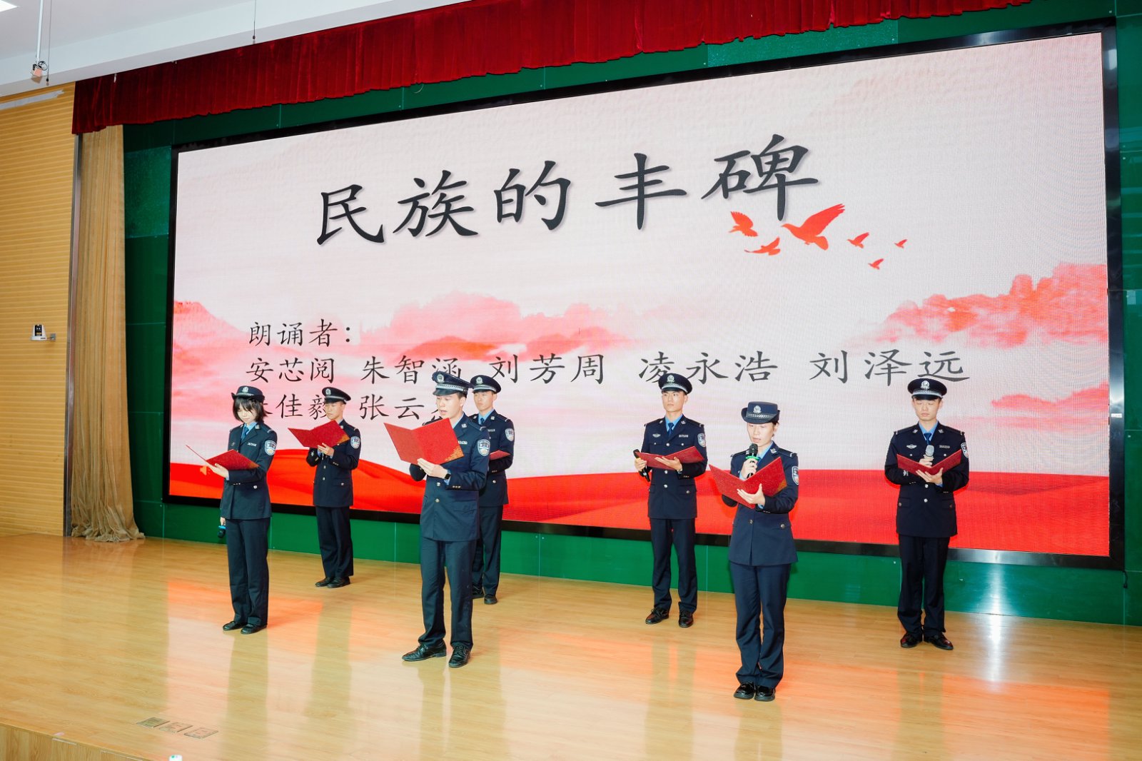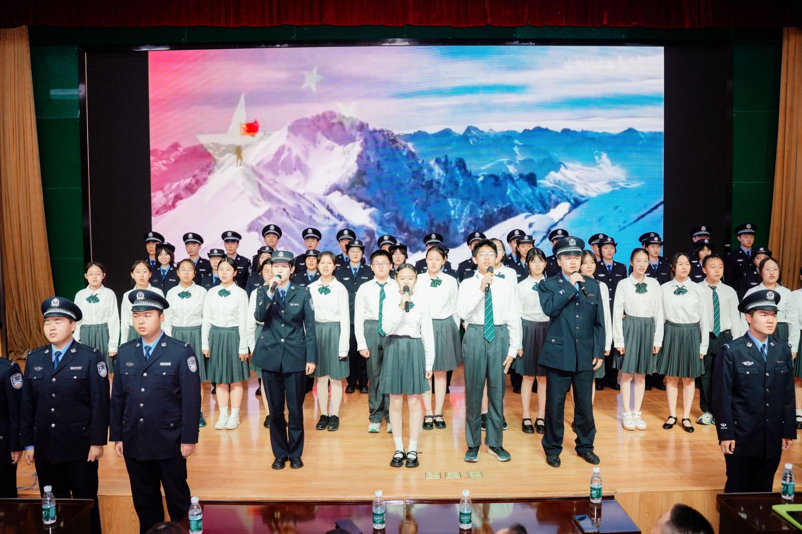 四分多钟的诗朗诵把3500万同胞的呐喊掷进少年胸膛,警徽与校服同沐朝阳,让诵读声共振礼堂。七位学警把14年血火凝成三句话:山河何以无恙,吾辈何以自强,英雄何以永生。台下的同学们热泪盈眶,攥紧拳头,切身体会何为家国。