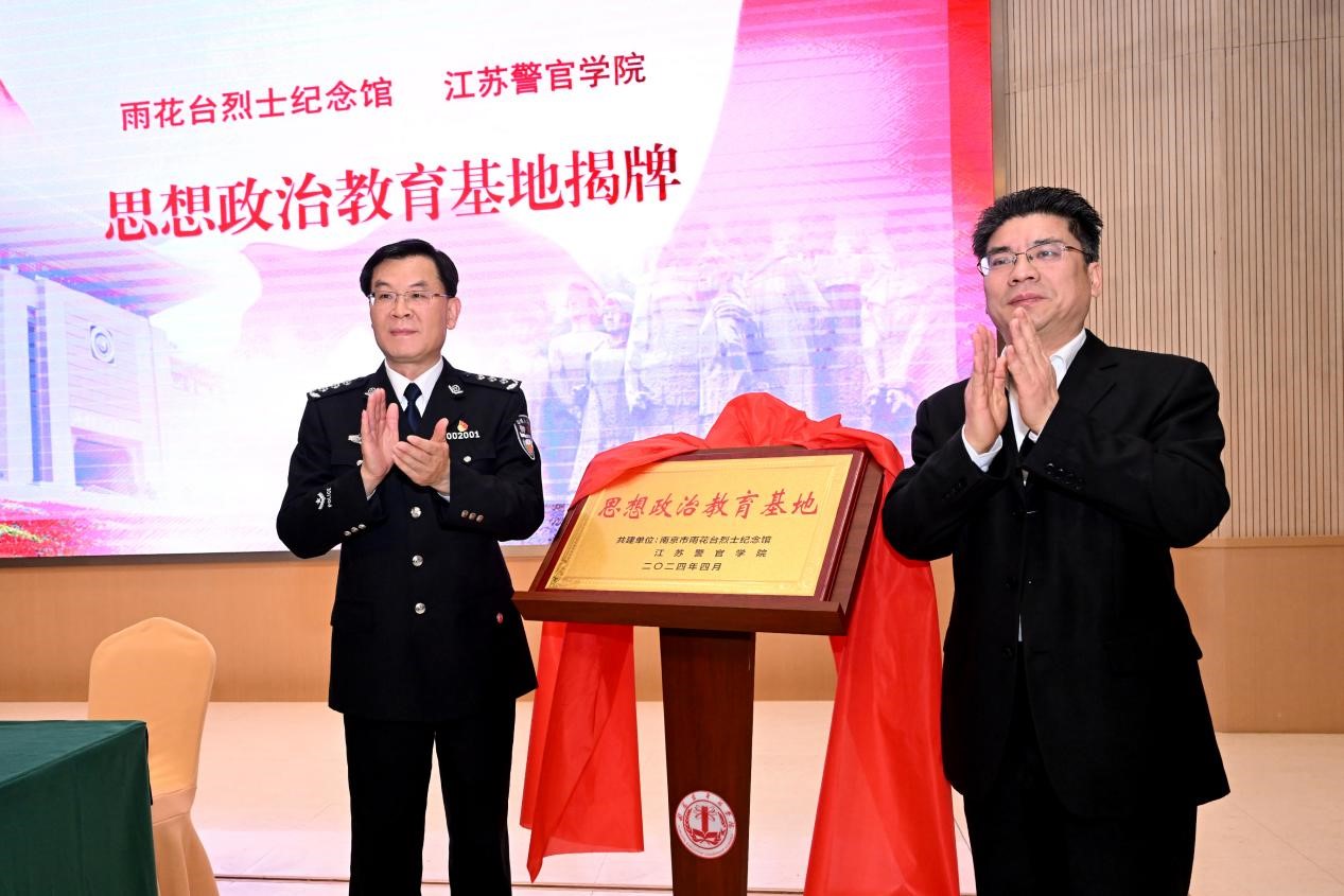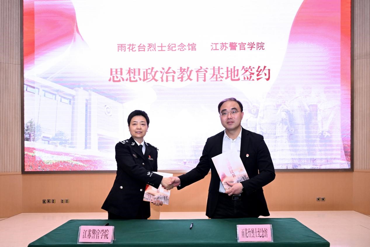 江苏省公安厅党委委员、学院党委书记夏存喜,学院党委副书记陈卫,雨花台烈士陵园管理局局长、党委书记,雨花台烈士纪念馆馆长刘斌,雨花台烈士陵园管理局党委委员、副局长葛俊杰出席共建“思想政治教育基地”签约仪式。
