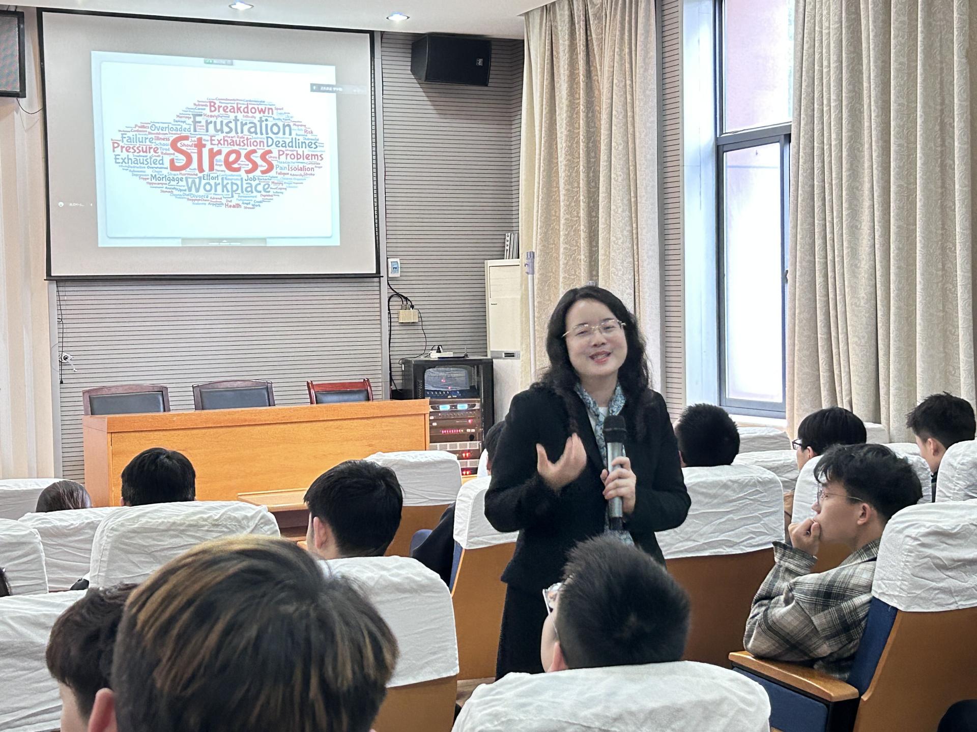讲座中周春燕通过调研的数据分析,当下研究生的焦虑水平超过普通人群,大部分研究生关注自己的专业发展前景,繁重的学业压力、就业压力与人际关系压力等都是研究生的压力来源。同时结合开场测试压力量表的各个得分区间,让同学们了解自己的压力水平,了解自己的心理健康状态。