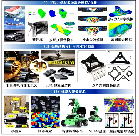 主要围绕智能制造与机器人、航空航天与新能源汽车、深海装备、工业母机等领域,开展(1)优化设计与多物理场耦合模拟(功能一体化设计、拓扑优化、纤维增强复合材料结构;有限元模拟、多尺度模拟、冲击动力学、热力耦合、流固耦合;(2)先进制造与3D打印(3D打印制造工艺、激光刻蚀界面制备、重型机床研制与加工工艺优化);(3)机器人技术(机器视觉、SLAM建图、路径规划与导航、运动控制、智能驾驶)。